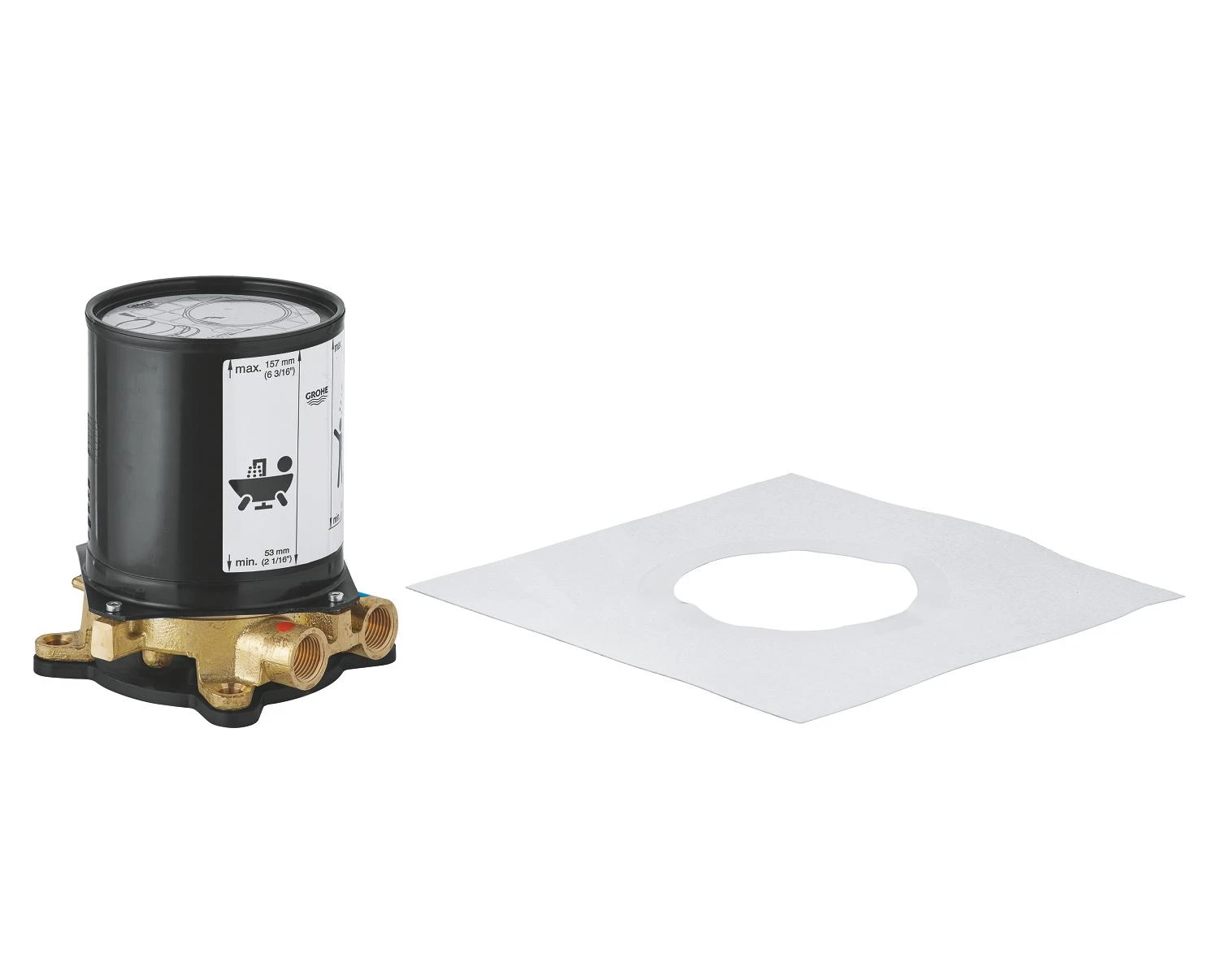 Het basisgarnituur is voorzien van twee ½” aansluitingen voor warm en koud water. Het binnenwerk bovenop biedt een grote variabiliteit tijdens de installatie, vooral dankzij de 360° horizontale montageplaat en 3° verticale verstelling. Afdichtingen, montagemateriaal en spoelpijp ontbreken natuurlijk niet. De installatiediepte voor badkranen/baduitlopen is 53–157 mm, met een compensatiediepte van 104 mm. De installatiediepte voor douchekranen is 65-158 mm, met een compensatiediepte van 92 mm.